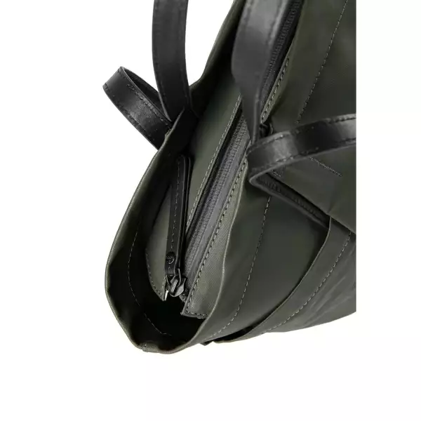 Das Hauptfach schließt mit einem Reißverschluss. Innen gibt es ein gepolstertes Notebookfach, ein kleines Reißverschlussfach, zwei Steckfächer, zwei Schlaufen für Stifte und ein herausnehmbares Extra-Täschchen. Außen befinden sich ein weiteres Reißverschlussfach auf der Rückseite, sowie zwei Fächer mit Druckknöpfen an den Seiten der Tasche.