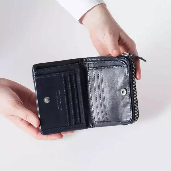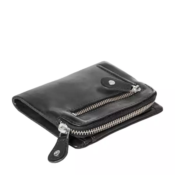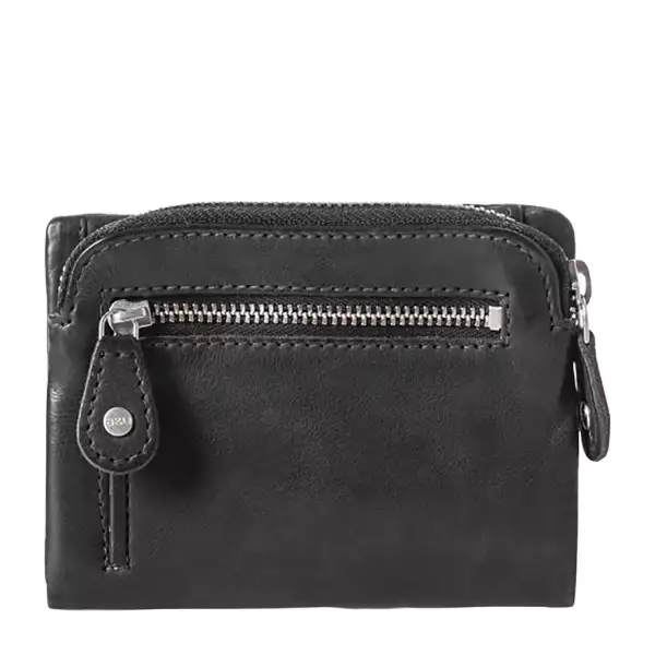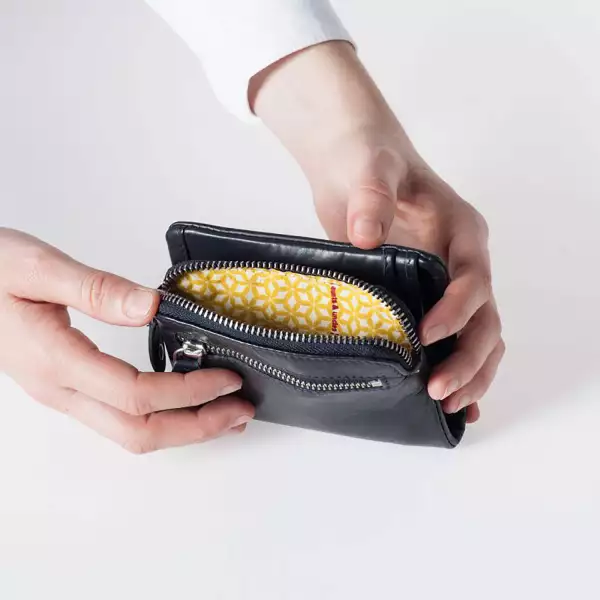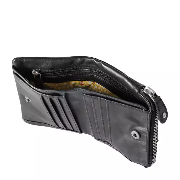 Die Cherry schließt mit einem Druckknopf. Innen gibt es ein Scheinfach mit einem integrierten Reißverschlussfach, vier Steckfächer und sechs Kartenfächer. Das Müpnzfach schließt mit einem Reißverschluss und befindet sich an der Seite. Auf der Rückseite gibt es ein weiteres Reißverschlussfach.