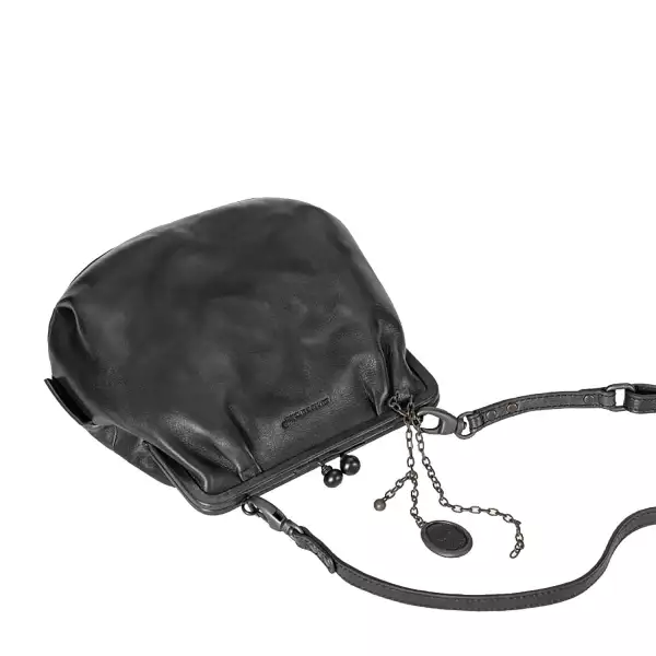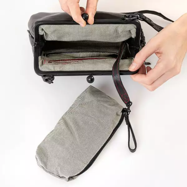 Innen gibt es ein Hauptfach mit einem Reißverschlussfach, einem Steckfach, einem Kartenfach und einem Schlüsselband. Außen befindet sich ein Reißverschlussfach auf der Taschen-Rückseite.