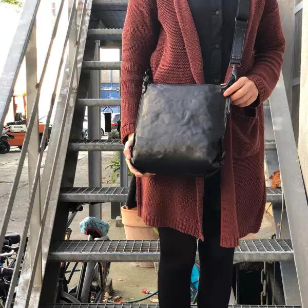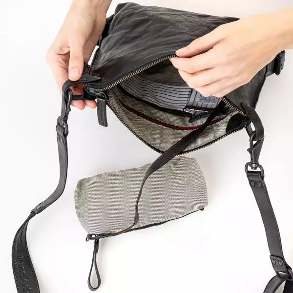 Das Hauptfach schließt mit einem Reißverschluss. Innen gibt es ein Reißverschlussfach, ein Handy- und ein Kartenfach, zwei Stiftschlaufen, ein Schlüsselband und ein herausnehmbares Extra-Täschchen. Ein weiteres Reißverschlussfach befindet sich auf der Rückseite.
