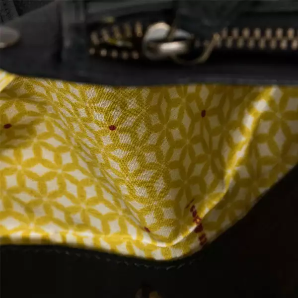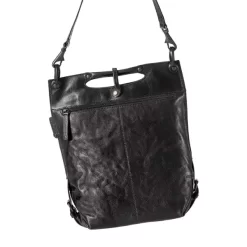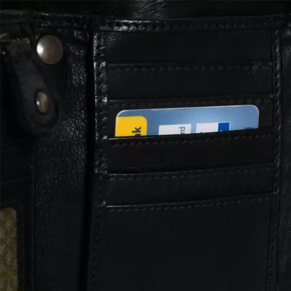 Unter dem Überschlag mit Druckknopf befinden sich zwei Reißverschlussfächer, ein Scheinfach mit Druckknopf, drei große Steckfächer und sieben Kartenfächer. Ein weiteres Reißverschlussfach ist auf der Rückseite.