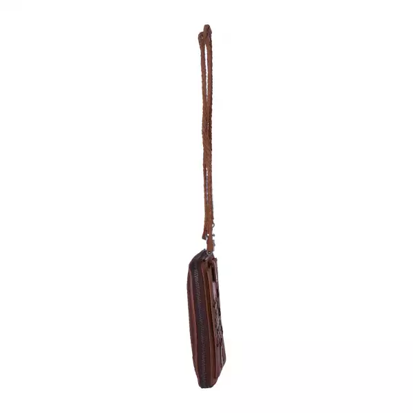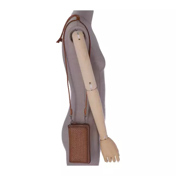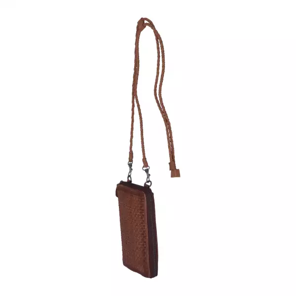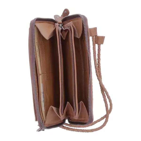Die Geldbörse schließt mit einem Reißverschluss und verfügt über zwei Scheinfächer, zwei Steckfächer, ein Münzfach mit Reißverschluss und acht Kartenfächer. Das Handyfach schließt mit einem Klettverschluss. Der wunderschöne, rund geflochtene Umhängeriemen ist abnehmbar.