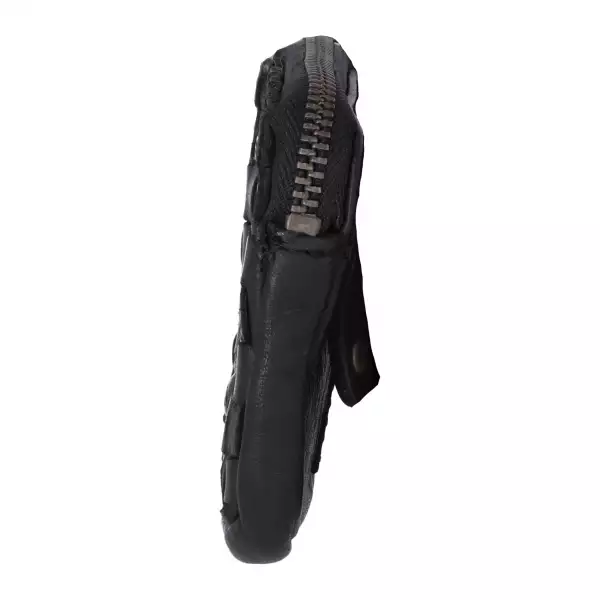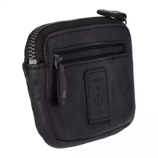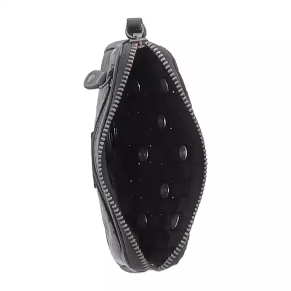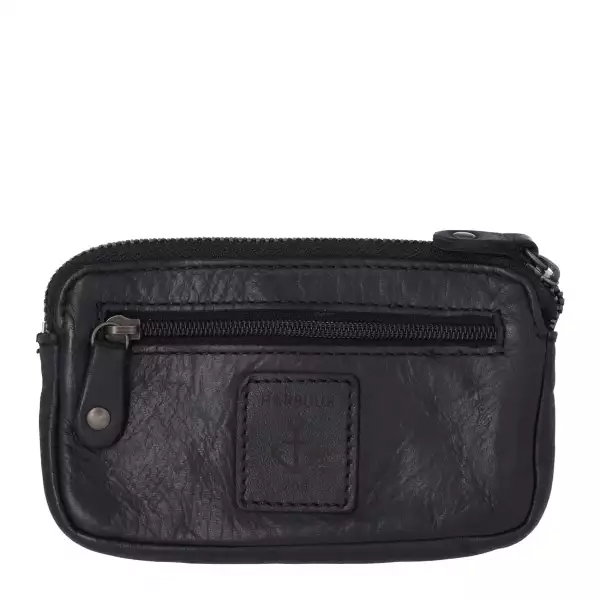 Das Hauptfach schließt mit einem Reißverschluss und beinhaltet zwei Schlüsselringe an einer Lederschlaufe. Ein weiteres Reißverschlussfach ist auf der Rückseite.