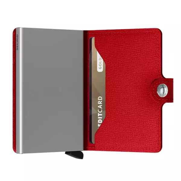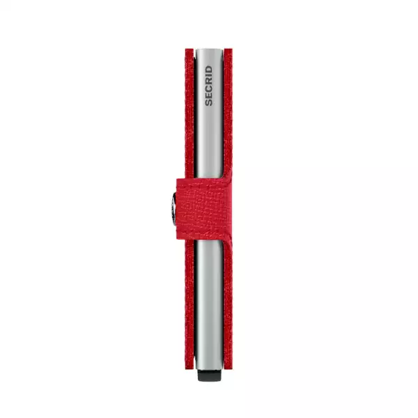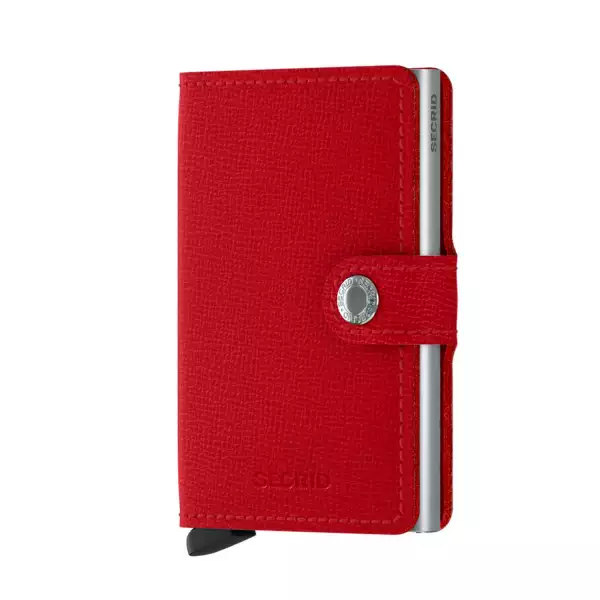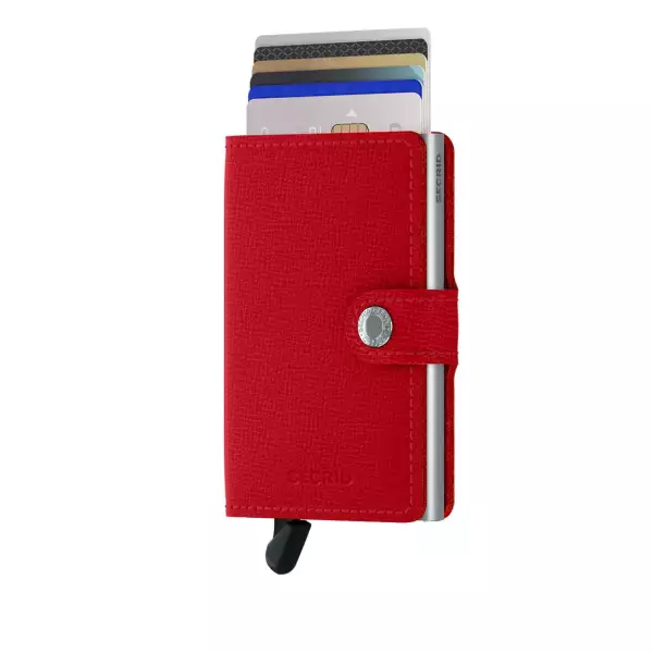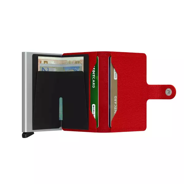 Das Miniwallet von Secrid besteht aus einem Cardprotector aus Aluminium und einer Hülle aus hochwertigem Leder, die mit einem Druckknopf schließt. In dem Cardprotector können bis zu vier Karten mit oder sechs Karten ohne Prägung untergebracht werden. Zudem ist in der Lederhülle Platz für sechs weitere Karten, sowie für Banknoten und Belege.