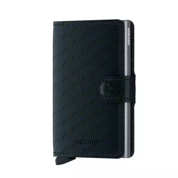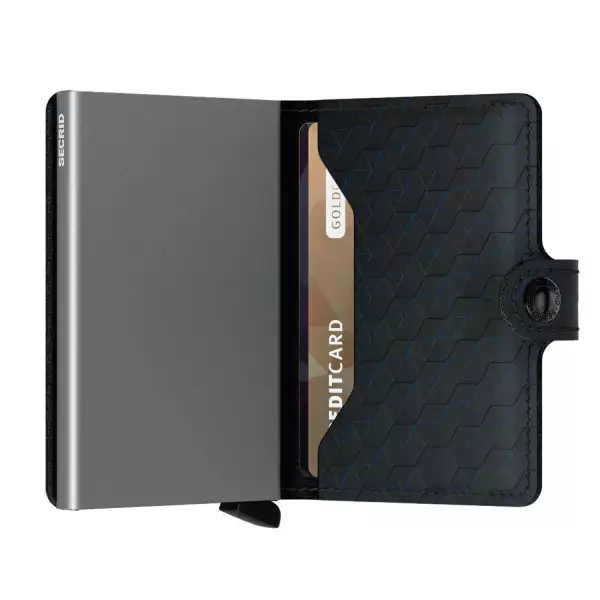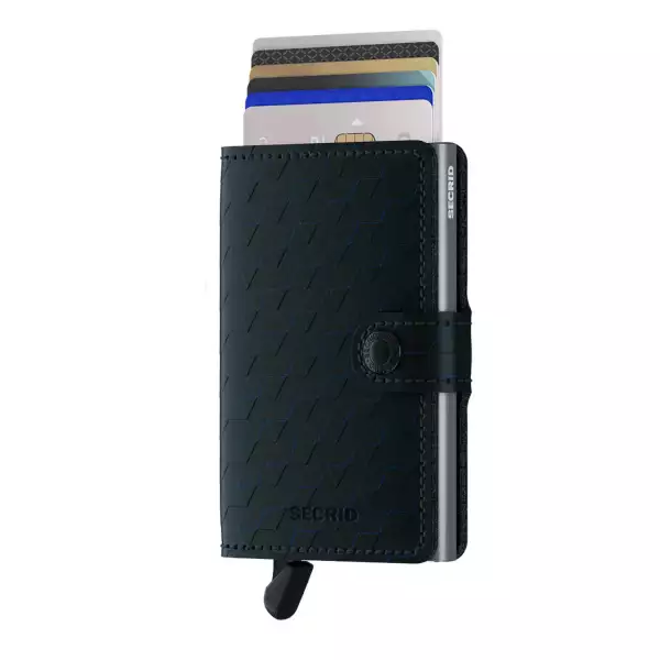 Das Miniwallet von Secrid besteht aus einem Cardprotector aus Aluminium und einer Hülle aus hochwertigem Leder, die mit einem Druckknopf schließt. In dem Cardprotector können bis zu vier Karten mit oder sechs Karten ohne Prägung untergebracht werden. Zudem ist in der Lederhülle Platz für sechs weitere Karten, sowie für Banknoten und Belege.