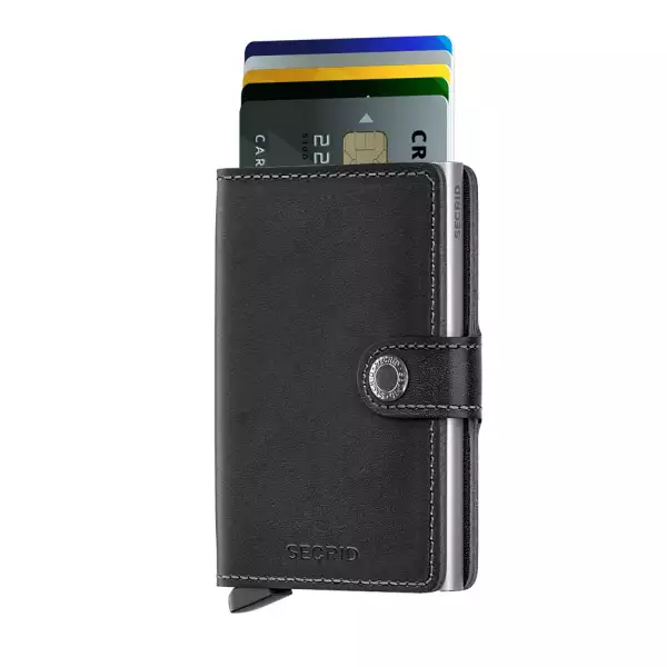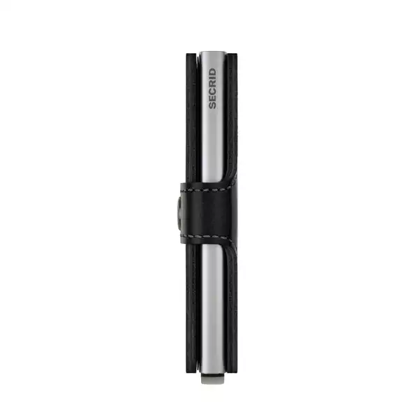 Das Miniwallet von Secrid besteht aus einem Cardprotector aus Aluminium und einer Hülle aus hochwertigem Leder, die mit einem Druckknopf schließt. In dem Cardprotector können bis zu vier Karten mit oder sechs Karten ohne Prägung untergebracht werden. Zudem ist in der Lederhülle Platz für sechs weitere Karten, sowie für Banknoten und Belege.