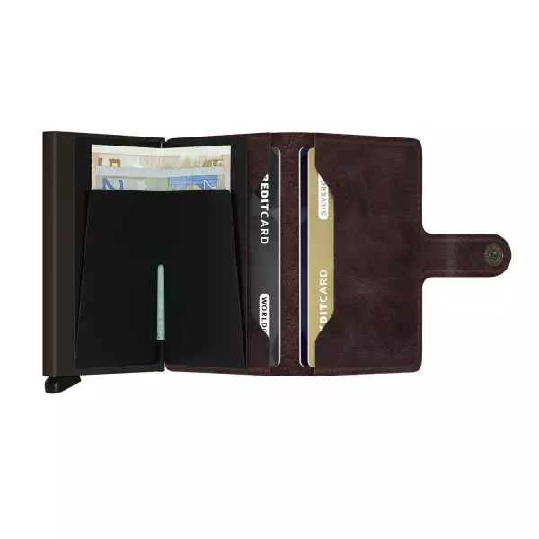 Das Miniwallet von Secrid besteht aus einem Cardprotector aus Aluminium und einer Hülle aus hochwertigem Leder, die mit einem Druckknopf schließt. In dem Cardprotector können bis zu vier Karten mit oder sechs Karten ohne Prägung untergebracht werden. Zudem ist in der Lederhülle Platz für sechs weitere Karten, sowie für Banknoten und Belege.