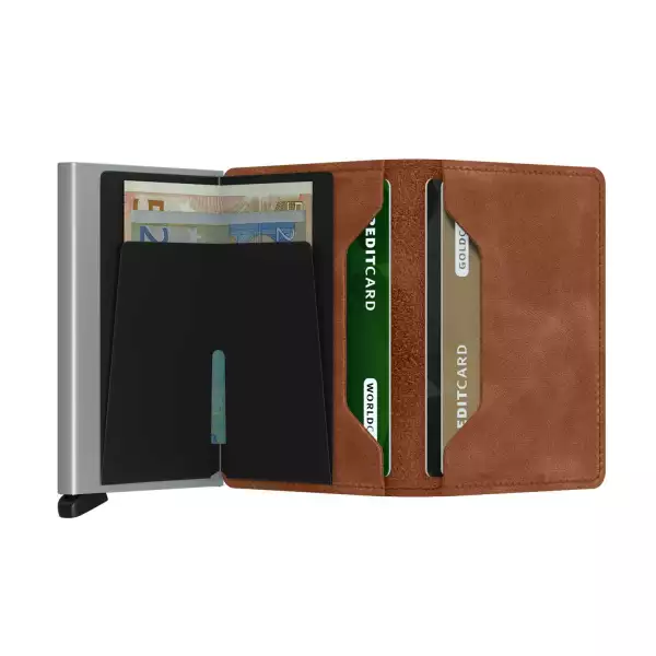 Das Slimwallet von Secrid besteht aus einem Cardprotextor aus Aluminium und einer Hülle aus hochwertigem Leder. In dem Cardprotector können bis zu vier Karten mit oder sechs Karten ohne Prägung untergebracht werden. Zudem ist in der Lederhülle Platz für sechs weitere Karten, sowie für Banknoten und Belege.