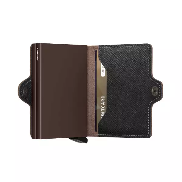 Das Twinwallet von Secrid besteht aus zwei zusammenhängenden “Cardprotectors” aus Aluminium und einer Hülle aus hochwertigem Leder. In den beiden “Cardprotectors” können bis zu acht Karten mit oder zwölf Karten ohne Prägung untergebracht werden. Zudem ist in der Lederhülle Platz für vier weitere Karten, sowie für Banknoten und Belege. Alle Karten in den “Cardprotectors” sind RFID (radio frequency identification) geschützt und somit vor kontaktlosem Datendiebstahl gesichert. Anhand eines patentierten Mechanismus werden alle Karten quasi mit einem Knopfdruck gefächert ausgeben.