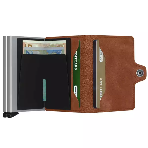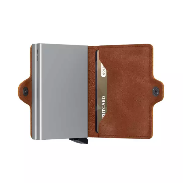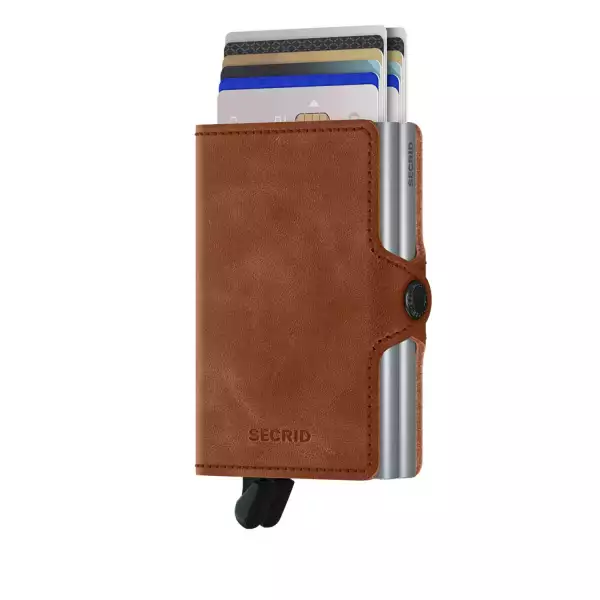 Das Twinwallet von Secrid besteht aus zwei zusammenhängenden “Cardprotectors” aus Aluminium und einer Hülle aus hochwertigem Leder. In den beiden “Cardprotectors” können bis zu acht Karten mit oder zwölf Karten ohne Prägung untergebracht werden. Zudem ist in der Lederhülle Platz für vier weitere Karten, sowie für Banknoten und Belege. Alle Karten in den “Cardprotectors” sind RFID (radio frequency identification) geschützt und somit vor kontaktlosem Datendiebstahl gesichert. Anhand eines patentierten Mechanismus werden alle Karten quasi mit einem Knopfdruck gefächert ausgeben.